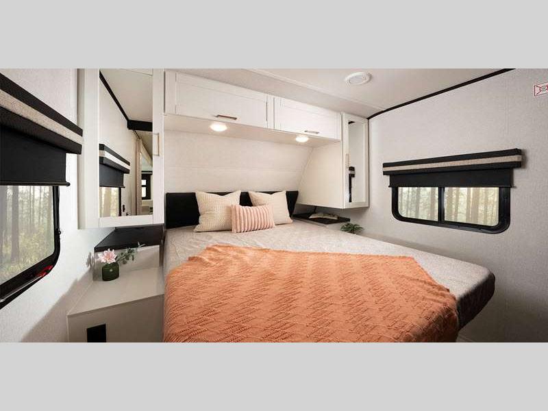 The power tongue jack and self-adjusting electric brakes make set-up a breeze so you can get to camping right away, and under mount spare tire, sewer hose storage compartment. Each model features automotive style aluminum rims. You will love the modern interior with stainless steel sink, seamless countertops throughout, and increased density foam for firmer dinette cushions.