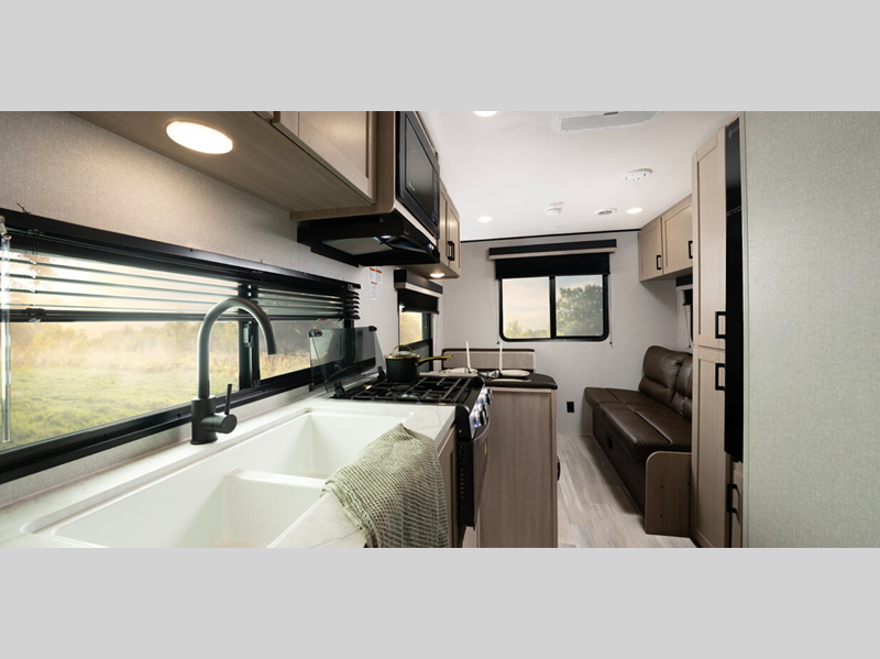 It will be effortless to enjoy time at the campground with interior comforts, such as vinyl flooring throughout, durable, residential-inspired kitchen countertops, and solid hardwood cabinet doors. The Camping in Comfort Package will add to each excursion with an on-demand tankless water heater, stabilizer jacks, marine grade exterior stereo speakers, and LED lights both inside and out!